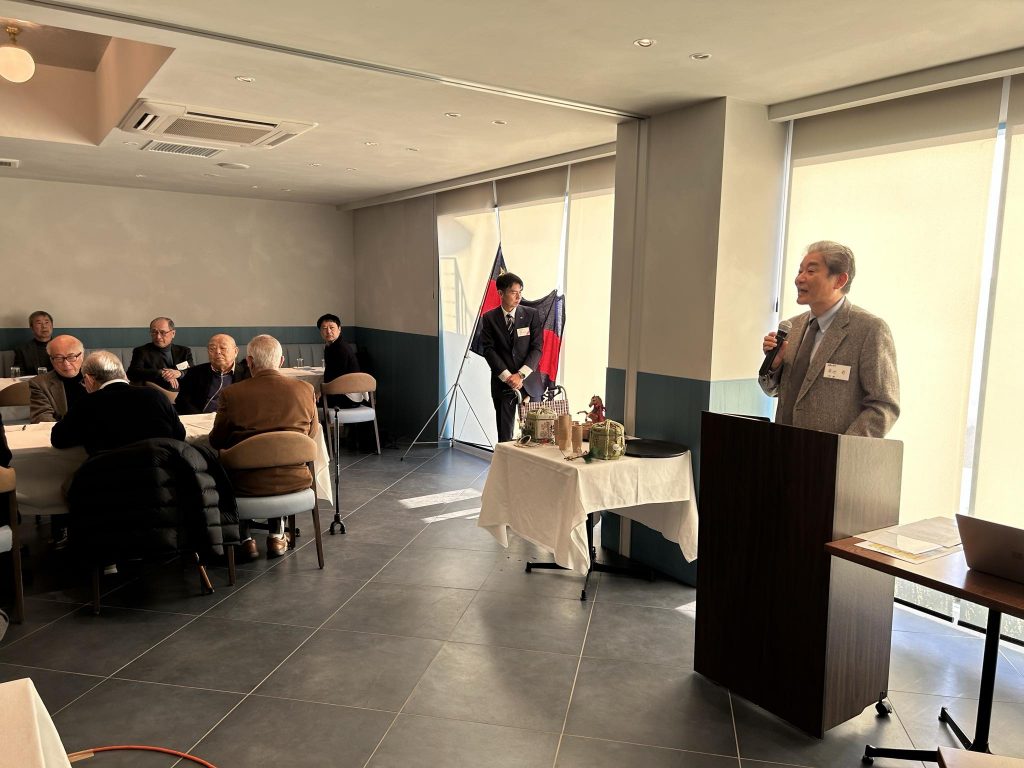 さて、今年の新年会、44名の会員の参加を得ての開催となりました。初めに菊池会長より年頭の挨拶が行われ、続いて田中副会長による乾杯の音頭で懇親会がスタートしました。懇親会は着席によるビュッフェ形式で、お料理は鮮魚のカルパッチョ・ピザ・パスタ・ポークグリルなどなど、各種ドリンクに正月なのでミニ樽酒も用意されました。